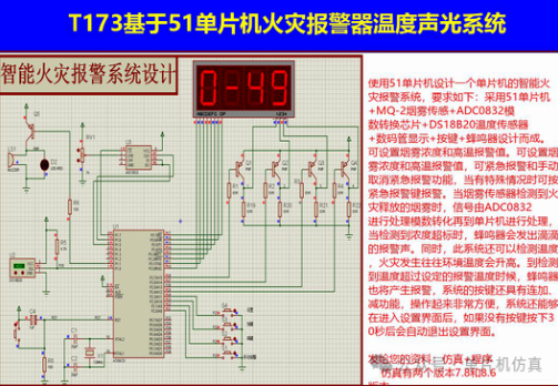 4、当烟雾传感器检测到火灾释放的烟雾时,信号由ADC0832进行处理模数转化再到单片机进行处理,当检测到浓度超标时,蜂鸣器会发出滴滴的报警声。同时,此系统还可以检测温度,火灾发生往往环境温度会升高。到检测到温度超过设定的报警温度时候,蜂鸣器也将产生报警,系统的按键还具有连加、减功能,操作起来非常方便,系统还能够在进入设置界面后,如果没有按键按下30秒后会自动退出设置界面。